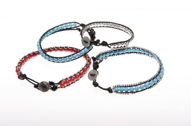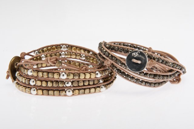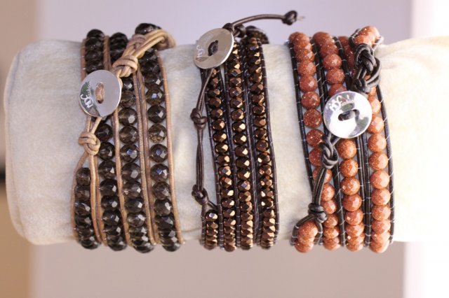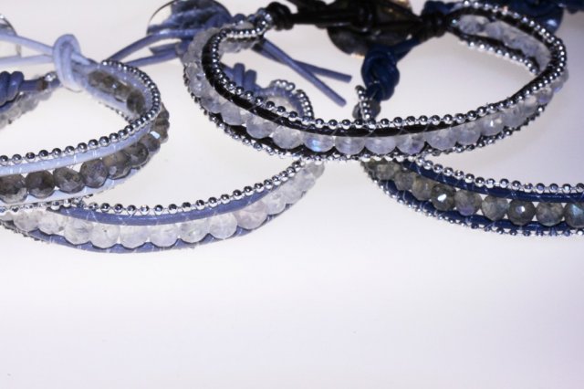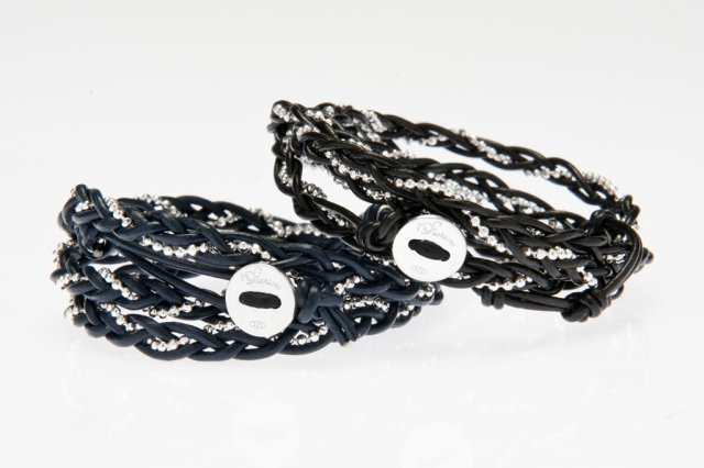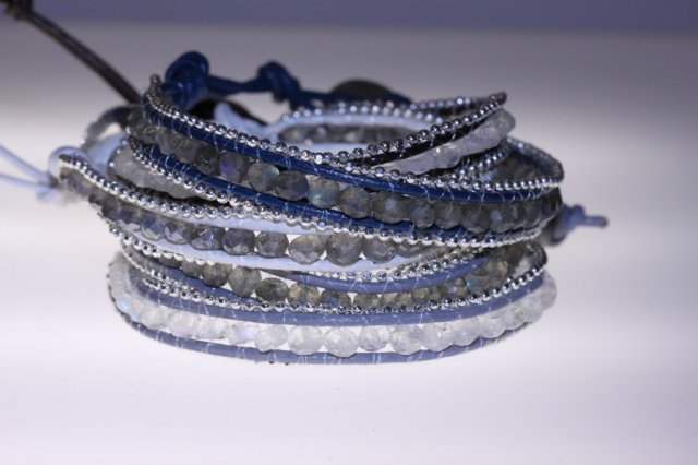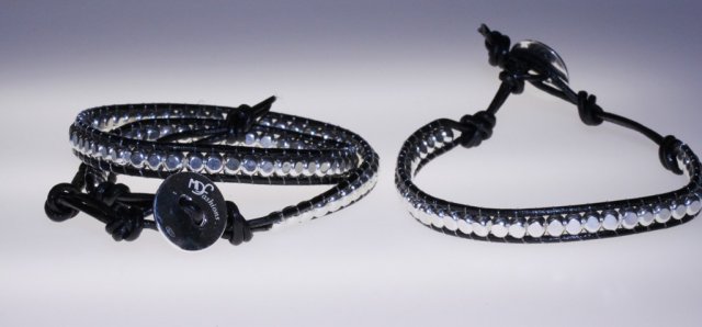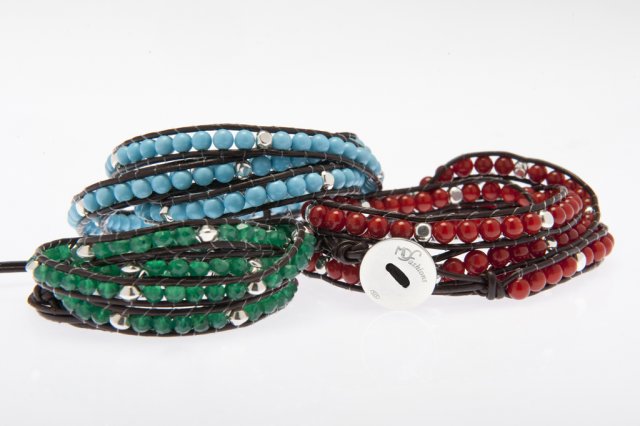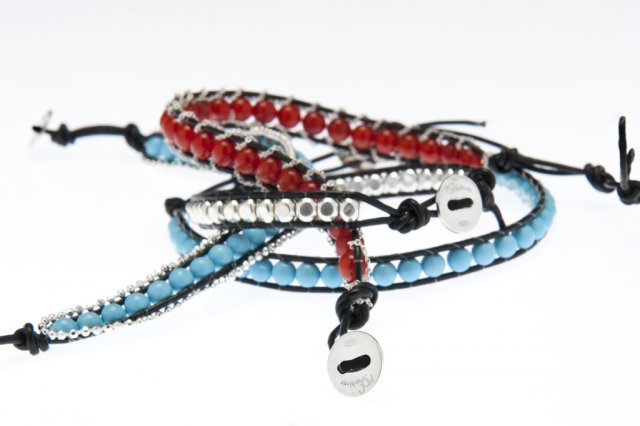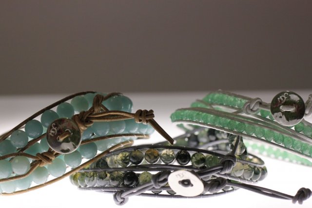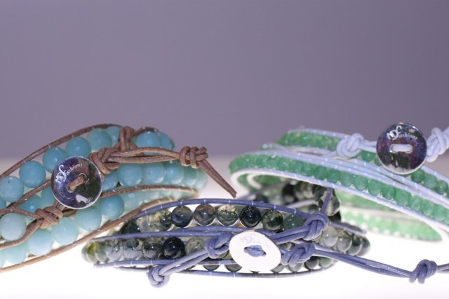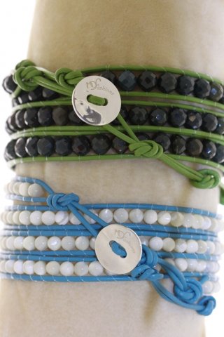 E' la nuova linea della MD Fashions Srl di bracciali raffinati e preziosi, dallo stile hippie chic che si arrotolano in più giri. Sono realizzati in fili di cuoio tra i quali scorrono argento e pietre semipreziose come acquamarina,ametista, smeraldo, quarzo rosa, quarzo citrino, quarzo fumè, spinello nero, pirite,labradorite grigia e bianca.